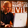 Description: lex luthor using a laptop and looking peeved, text: bad porn makes Lex evil