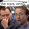 Description: rodney mckay and radek zelenka, rodney's dialogue bubble obscures zelenka's and reads: stop saying words