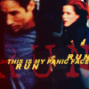 Description: fox mulder and dana scully running away blurrily in FBI windbreakers, text: this is my panic face/run run run